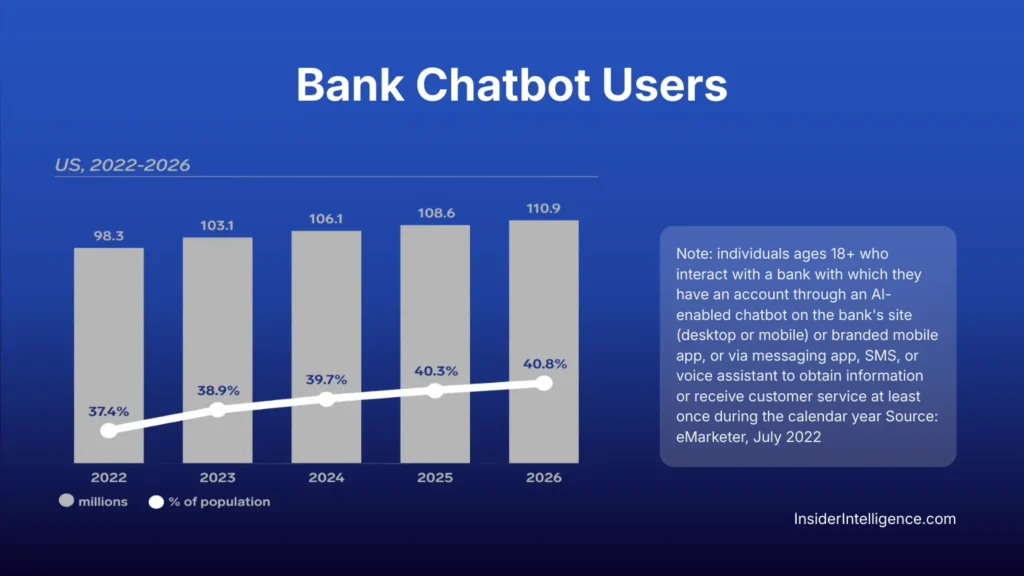 Sustained growth in banking chatbot usage confirms that adoption is not temporary or technology-driven alone — it reflects a shift in customer behavior. In the U.S., more than 110 million people will interact with automated banking assistants by 2026, representing over 40% of the population.