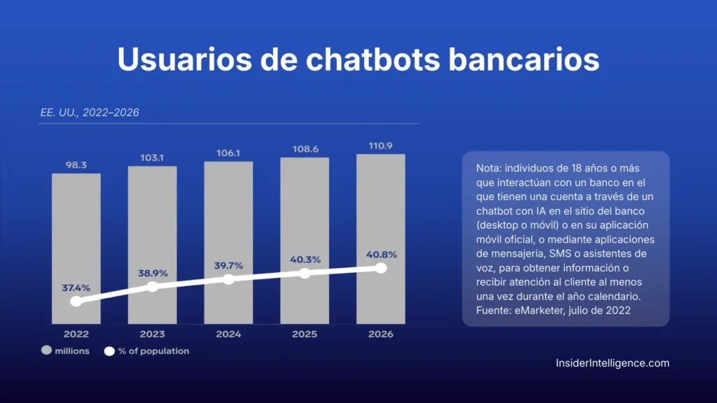 El crecimiento sostenido en el uso de chatbots bancarios confirma que la adopción no es circunstancial ni impulsada solo por la tecnología, sino por un cambio en el hábito del cliente. En Estados Unidos, más de 110 millones de personas interactuarán con asistentes bancarios automatizados hacia 2026, representando más del 40% de la población.