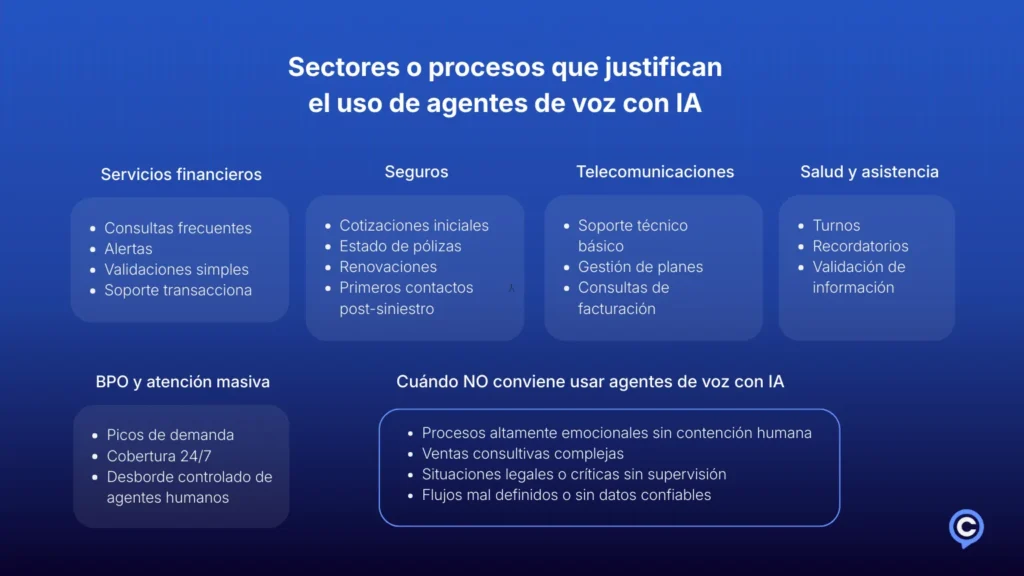 En esos escenarios, la voz reduce fricción, acelera la resolución y libera capacidad humana para tareas de mayor valor. Donde esas condiciones no existen, la automatización suele fallar. En el gráfico a continuación se pueden ver algunos procesos que justifican el uso de agentes de voz con IA: