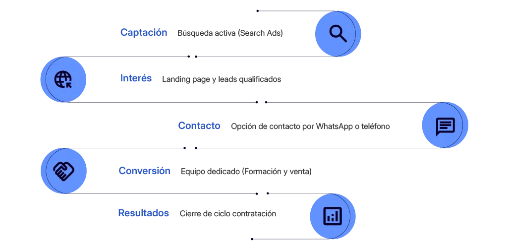 Un modelo que combina performance digital, atención humana y tecnología conversacional para acompañar al cliente desde la búsqueda hasta la contratación.